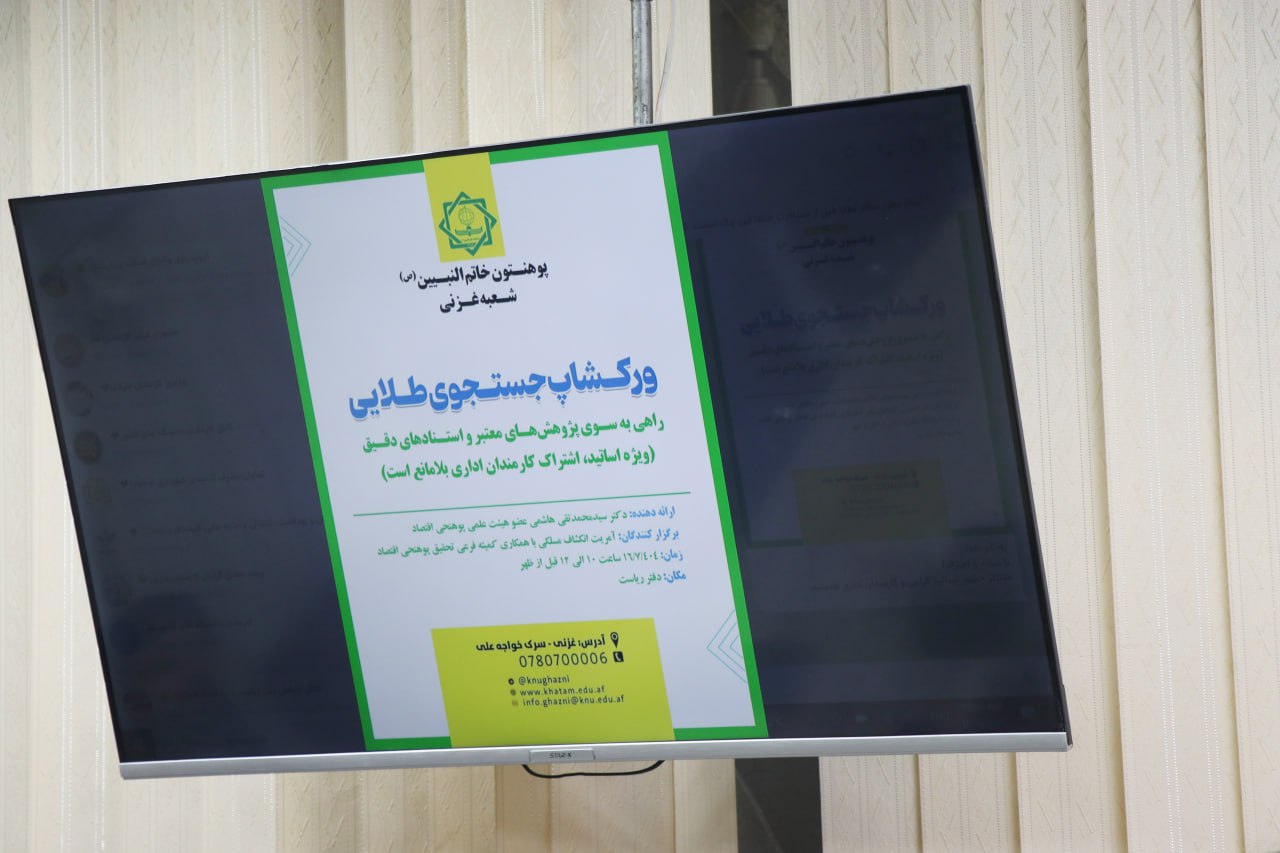 آمریت انکشاف مسلکی با همکاری کمیته تحقیق پوهنحی اقتصاد، روز چهارشنبه 16 /7/ 1404 ورکشاپ یک روزهای با عنوان «جستجوی طلایی: راهی به سوی پژوهشهای معتبر و استنادهای دقیق» را برگزار نمود. این برنامه با حضور جمعی از اعضای هیئت علمی و کارمندان علاقهمند به پژوهشهای علمی، با ارائه جناب آقای دکتر سیدمحمدتقی هاشمی برگزار گردید.