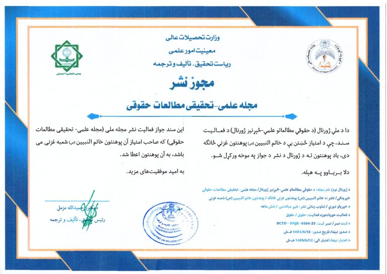 پوهنتون خاتمالنبیین(ص)شعبه غزنی با افتخار اعلام میدارد که مجله علمی ـ تحقیقی “مطالعات حقوقی” وابسته به این نهاد اکادمیک، پس از طی مراحل تخصصی ارزیابی و تطبیق معیارهای وزارت تحصیلات عالی، موفق به اخذ مجوز رسمی نشر از ریاست تحقیق، تألیف و ترجمه این وزارت گردیده و بهصورت رسمی در فهرست مجلات معتبر علمی ـ تحقیقی کشور درج گردیده است.
